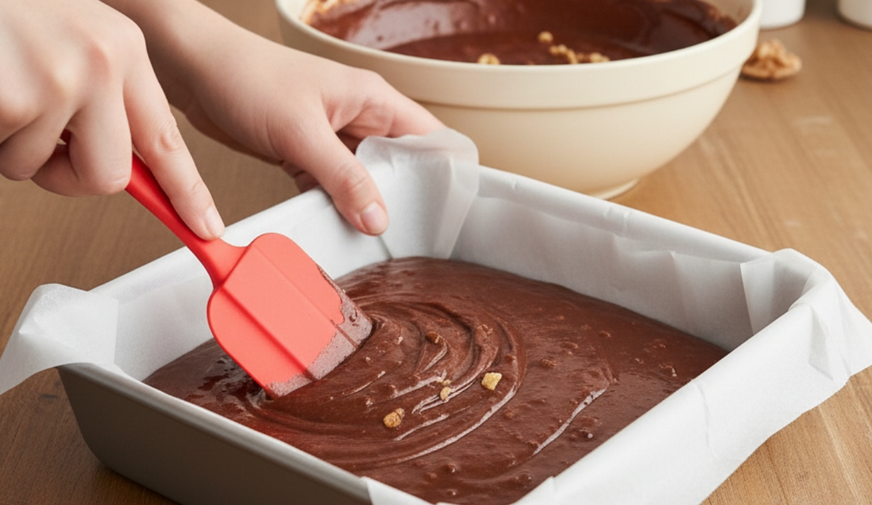 Mezclar la totalidad de la premezcla con el aceite, los huevos y el agua por 4 minutos con batidora a velocidad media (o a mano), hasta incorporar bien. Agregar las nueces picadas y mezclar.