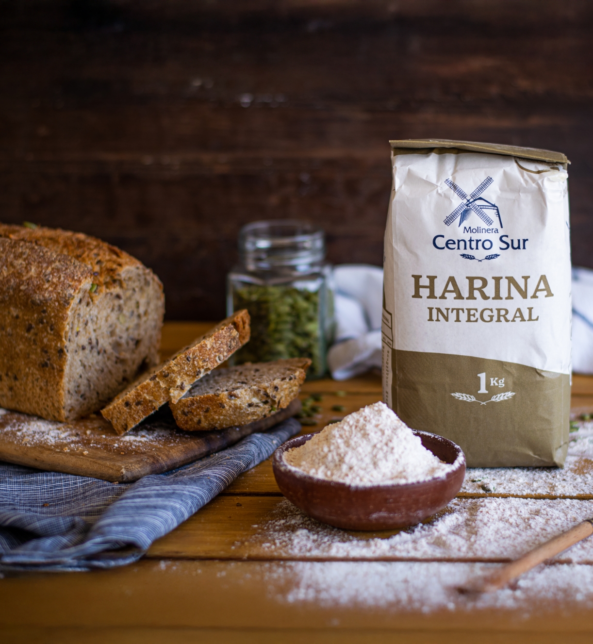 En un bowl, mezclar la harina integral con la harina sin polvos. Hacer un orificio al centro; alrededor añadir la sal y el azúcar, y al centro la levadura y el aceite. Mezclar suavemente con las manos, incorporando poco a poco el agua tibia hasta obtener una masa suave que no se pegue.